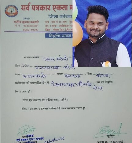 ‘अमन सोनी’ बनाए गए सर्व पत्रकार एकता महासंघ संगठन के जिलाध्यक्ष, जांजगीर-चांपा जिले की मिली जिम्मेदारी।