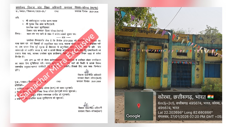 कोरबा/करतला (समाचार मित्र) कोरबा जिले के एक गांव में गणतंत्र दिवस समारोह के बाद दूसरे दिन शिक्षकों ने आपसी सहमति से स्कूल का स्थानीय अवकाश घोषित कर दिया। मामला करतला विकासखण्ड अंतर्गत ग्राम पंचायत भैंसामुड़ा के आश्रित ग्राम कुर्रिहापारा के शासकीय प्राथमिक शाला का है जहां शिक्षकों ने खुद को नियमों से परे रखते हुए गणतंत्र दिवस समारोह के बाद अगले दिन स्कूल की छुट्टी घोषित कर दी। छुट्टी घोषित करने के कारण अगले दिन मंगलवार को कोई भी शिक्षक स्कूल नहीं आया जिससे स्कूल में ताला जड़ा हुआ था। स्थानीय लोगों ने बताया कि मंगलवार को कोई भी शिक्षक और छात्र छात्राएं स्कूल नहीं पहुंचे थे।