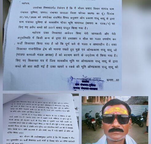 कोरबा (समाचार मित्र) कोरबा जिले के करतला विकासखण्ड अंतर्गत ग्राम पंचायत में गुमिया में सरपंच का फर्जी सील और हस्ताक्षर कर उपसरपंच पति एवं भाजपा मंडल अध्यक्ष बरपाली ओमप्रकाश उर्फ़ राजू साहू के खिलाफ़ फर्जी शिकायत करने का मामला सामने आया है। गुमिया सरपंच गौतम प्रसाद बियार ने मामले को गंभीरता से लेते हुए इसकी शिकायत जिला कलेक्टर से की है। दअरसल मामला ये है कि ग्राम पंचायत ग़ुमिया में चारागाह और गोचर भूमि पर अवैध अतिक्रमण की शिकायत सरपंच एवं अन्य स्थानीय लोगों ने मिलकर जनदर्शन में किया है। कुछ दिनों बाद जब मामला संज्ञान में आया तो सरपंच गौतम प्रसाद बियार द्वारा अपने ही पदनाम और सील से दस्तावेजों में हस्ताक्षर देख हैरान हो गए । मामले में सरपंच ने फर्जी कुटरचना से तैयार शिकायत पत्र के खिलाफ़ जांच कराने जिला कलेक्टर से शिकायत की है। शिकायत पत्र में सरपंच ने इस बात का उल्लेख किया है कि भाजपा मंडल अध्यक्ष बरपाली ओमप्रकाश उर्फ़ राजू साहू के साथ मिलकर गांव में कई विकास कार्य किए है। जिस शासकीय भूमि पर अवैध कब्जे की शिकायत हुई है उसको ओमप्रकाश साहू के कथित मामा फिरतराम द्वारा उन्हें 15 वर्ष पूर्व ही प्रदान कर दिया गया था जिसपर राजू साहू द्वारा कई वर्षों से कब्ज़ाकाश्त कर खेती किसानी करते आ रहे हैं। उक्त भूमि पर अतिक्रमण की शिकायत पूर्णतः निराधार और फर्जी है।
