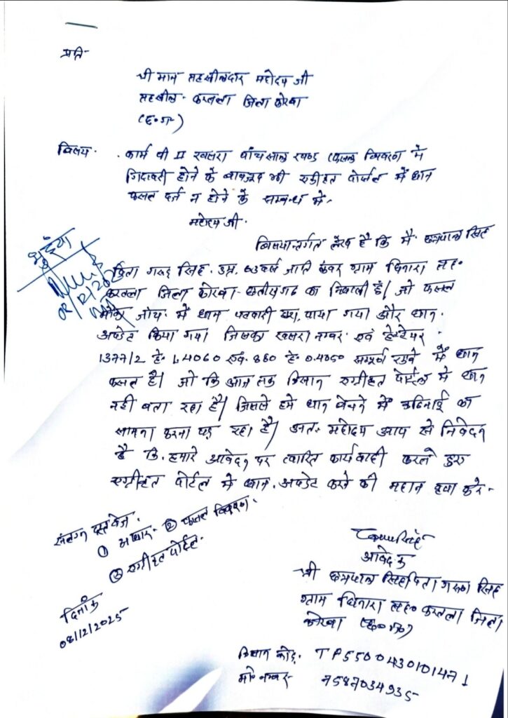 करतला तहसीलदार राहुल पाण्डेय ने बताया कि भुइया पोर्टल में सुधार हो गया है पर ऑनलाइन में दिखा नहीं रहा है, पोर्टल में सुधार हेतु जिला कार्यालय से रायपुर NIC को भेजा गया है जल्दी दोनों किसानों का सुधार हो जाएगा।