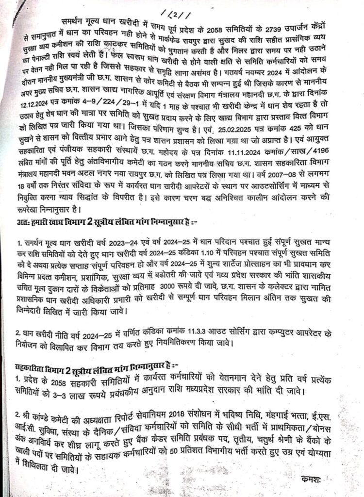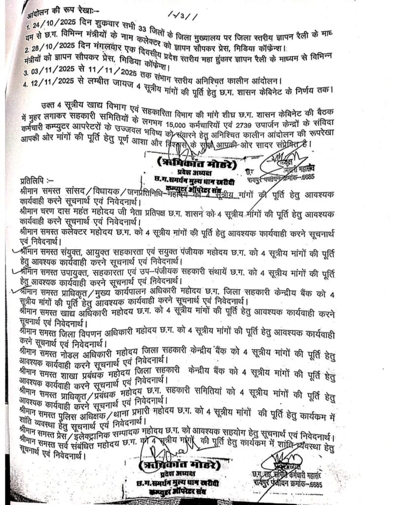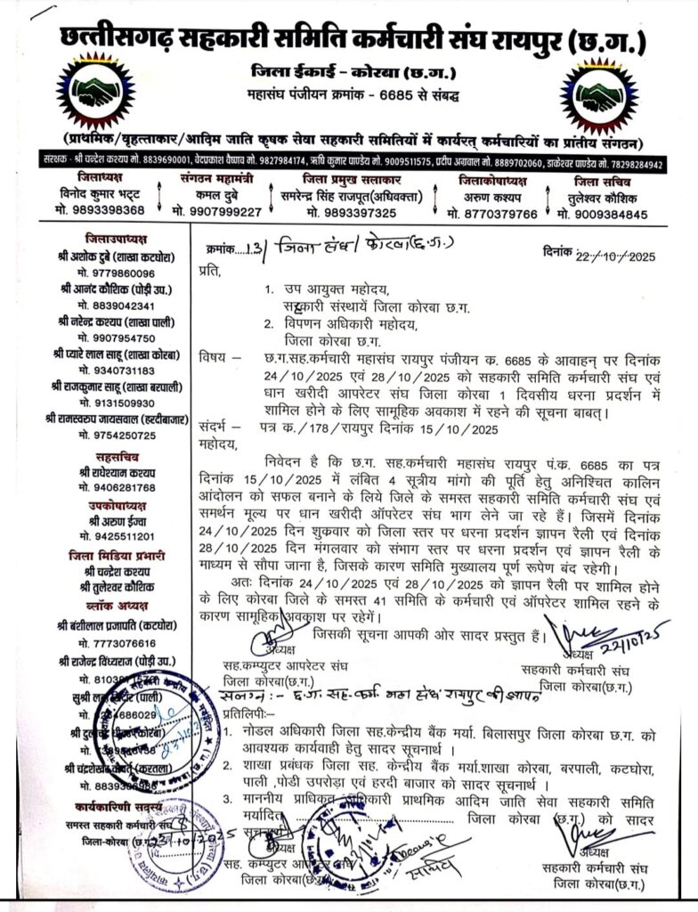 यहाँ बताना होगा कि छत्तीसगढ़ शासन ने खरीफ विपणन वर्ष 2025 -26 में 15 नवंबर से 31 जनवरी 2026 तक एग्रिस्टैक पोर्टल में पंजीकृत किसानों से समर्थन मूल्य पर धान खरीदी करने का निर्णय लिया है। लेकिन इसके पूर्व ही एक माह से चली आ रही चरणबद्ध आंदोलन के तहत छत्तीसगढ़ सहकारी समिति कर्मचारी संघ रायपुर के आव्हान पर प्रदेश के 2058 समितियों के कर्मचारी 12 नवंबर से 4 सूत्रीय मांगों को लेकर बेमियादी हड़ताल में चले गए हैं। प्रबंधक ,विक्रेता ,डाटा एंट्री ऑपरेटर ,चौकीदार से लेकर हमाल तक के हड़ताल तक में जाने से सरकार की नींद उड़ गई है।