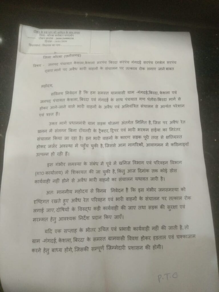 विकासखण्ड कटघोरा ग्राम पंचायत केशला, बिरदा, गंगडाई एवं रंगबेल के पंचायत सरपंचों ने जिला खनिज अधिकारी को पत्र लिखकर पूर्व में मांग की थी कि तत्काल भारी वाहनों के आवागमन पर रोक लगानी चाहिए परंतु खनिज विभाग के संरक्षण में बिना रॉयल्टी अवैध रेत परिवहन धड़ल्ले से जारी है।