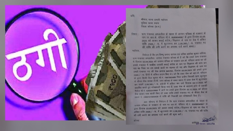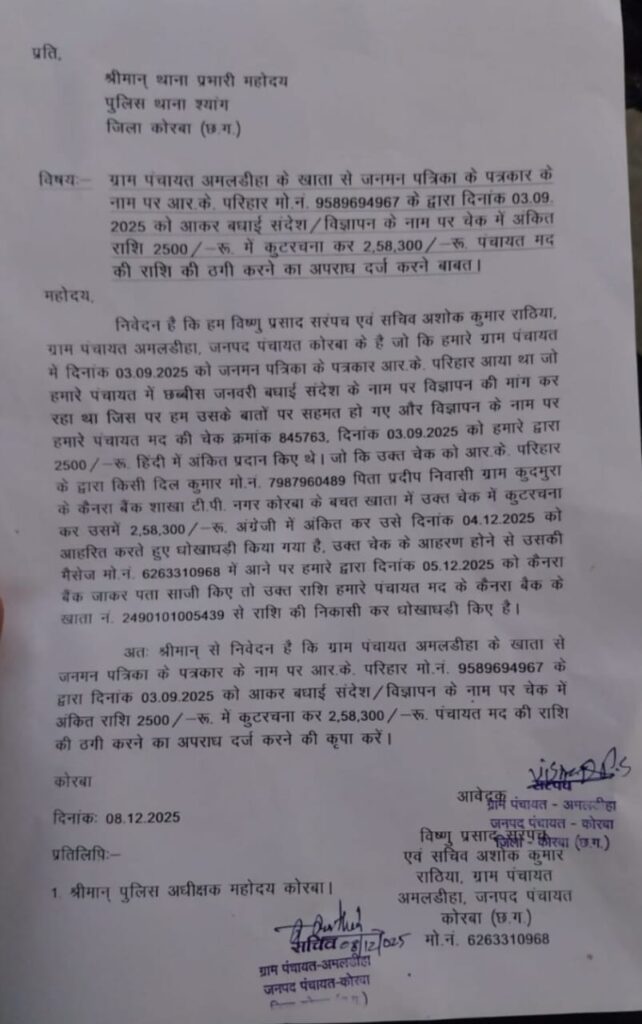 सरपंच विष्णु प्रसाद और सचिव अशोक कुमार राठिया ने थाना श्यांग में शिकायत दर्ज कराई है कि स्वयं को जनमन पत्रिका का पत्रकार बताने वाला आर.के. परिहार दिनांक 03 सितंबर 2025 को पंचायत आया था। उसने 26 जनवरी बधाई संदेश के नाम पर विज्ञापन देने की मांग की, जिस पर पंचायत की ओर से 2500 रुपये का चेक क्रमांक 845763 जारी किया गया था। चेक में राशि हिंदी में अंकित थी। आरोप है कि आर.के. परिहार ने चेक में कुटरचना करते हुए 2500 रुपये की जगह 2,58,300 रुपये अंग्रेजी में अंकित कर दिया और अगले ही दिन 04 दिसंबर 2025 को यह राशि दिल कुमार निवासी कुदमुरा के कैनरा बैंक, टीपी नगर शाखा के खाते में जमा कर आहरित कर ली।ऐसे ही एक और मामला तौलीपाली पंचायत में भी देखने को मिला सरपंच एवं सचिन ने ₹1500 का चेक दिया चेक में छेड़खानी कर लगभग 37000 रुपये निकाल लिया गया, जब पंचायत मद के खाते से राशि कटने का मैसेज आने के बाद 05 दिसंबर को बैंक जाकर जब जानकारी ली गई तो धोखाधड़ी की पुष्टि हुई। प्रतिनिधियों ने आरोपित के खिलाफ अपराध दर्ज कर कड़ी कार्रवाई की मांग की है।कोरबा जिले में हुए ठगी से ग्राम पंचायतो में हड़कंप मच गया है।